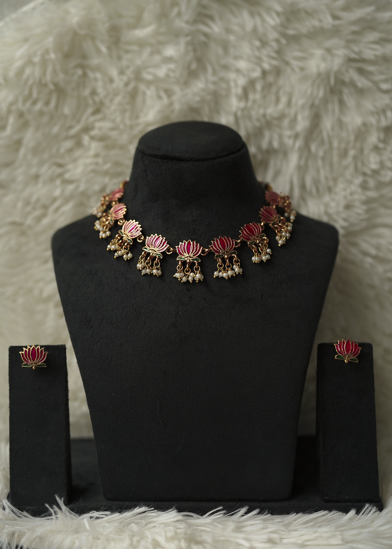 Make a bold yet graceful statement with this vibrant red lotus motif necklace set. Each lotus charm is finely crafted with rich red enamel and adorned with dangling pearl drops, adding movement and charm to your look. Comes with matching earrings — perfect for festive wear, temple visits, or gifting.